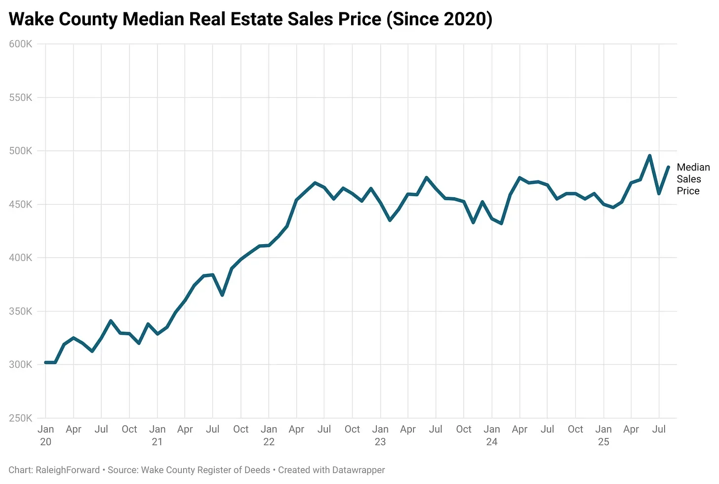 Wake County median real estate value increases by $24,750 to $484,750, per the Wake County Register of Deeds office. You can see a simple chart of that monthly data since January 2020 below: